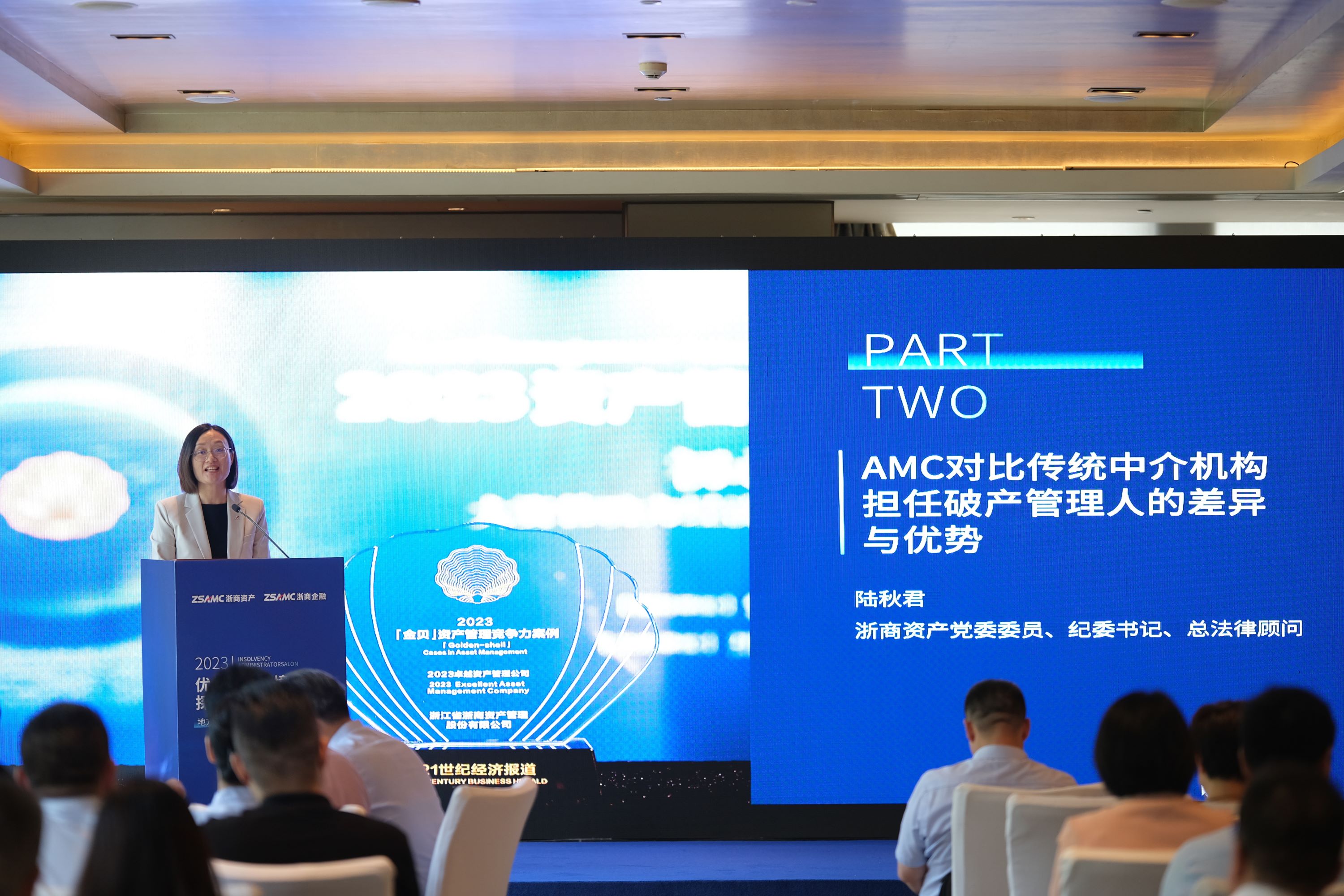 浙商資產(chǎn)黨委委員、紀委書記、總法律顧問陸秋君從專業(yè)經(jīng)驗、治理結(jié)構(gòu)、人才配置、資源整合、資金融通等方面著重分析了AMC對比傳統(tǒng)中介機構(gòu)在擔任破產(chǎn)管理人方面的比較優(yōu)勢,并指出AMC應(yīng)準確把握當前經(jīng)濟社會發(fā)展新形勢,加強破產(chǎn)管理業(yè)務(wù)的雙向加速賦能,依照前瞻化、市場化、法治化原則,因地制宜,采取債權(quán)轉(zhuǎn)讓、托管、債務(wù)重組、資產(chǎn)重組、共益?zhèn)?、破產(chǎn)重整、市場化債轉(zhuǎn)股、財務(wù)顧問等多種方式化解風險,充分發(fā)揮地方AMC功能作用。
