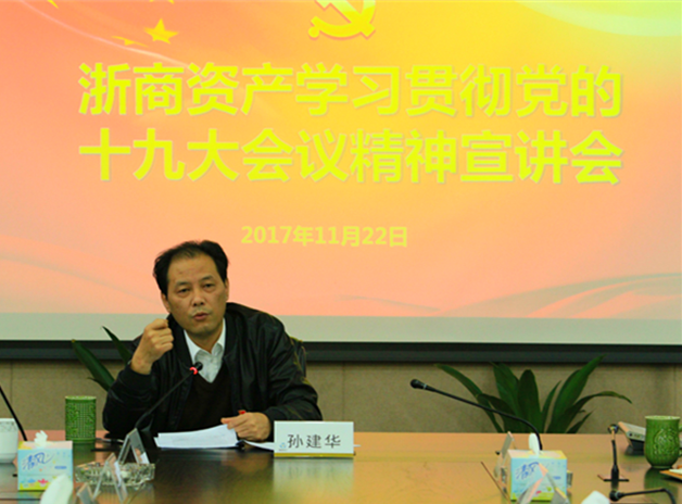 孫建華書記要求,要在十九大精神的指引下,推動浙商資產(chǎn)加速發(fā)展。一要牢牢把握十九大對國有企業(yè)的有關(guān)論述,按照“培育一流企業(yè)”要求,更高標準、更高要求制定戰(zhàn)略規(guī)劃,堅持勇立潮頭,盡快打造資產(chǎn)管理公司全國性品牌;二要對照金融領(lǐng)域作出的針對性部署,助力解決不平衡不充分的發(fā)展、助力省委提出的鳳凰計劃、助力集團產(chǎn)業(yè)共融發(fā)展,把服務(wù)實體經(jīng)濟作為天然使命,擔起責任、有所作為;三要根據(jù)十九大精神,研究如何提升公司競爭力的問題,在站穩(wěn)資本優(yōu)勢的基礎(chǔ)上,依靠出色業(yè)務(wù)能力,做好企業(yè)文化,提升品牌影響力;四要補齊工作短板,按照上市公司標準和監(jiān)管部門對四大AMC公司監(jiān)管標準這“兩個標準”,拉高標桿,穩(wěn)健推進制度、管理和信息化等工作;五要加強黨的建設(shè),把黨領(lǐng)導一切和公司工作結(jié)合起來,抓好領(lǐng)導班子、黨支部和黨員隊伍建設(shè),努力在黨建工作方面出成效、亮名片;六要深化人才隊伍建設(shè),在關(guān)心人才、提供平臺等方面下功夫,不斷優(yōu)化引才育才用才的良好環(huán)境,把各方精英吸收到公司來,打造人才高地。