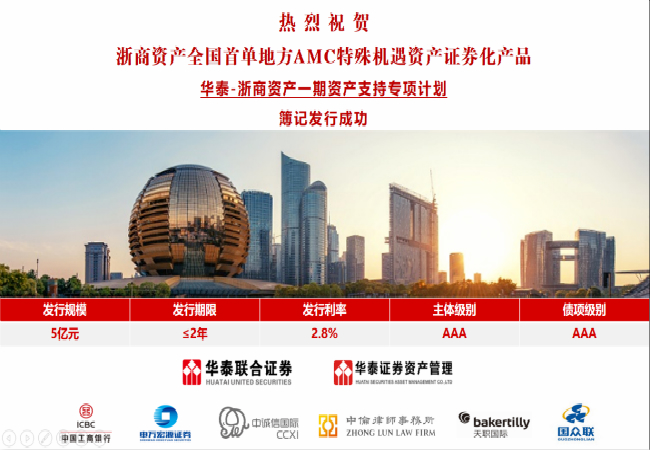 該項目實施期間,浙江省地方金融監(jiān)管局及上海證券交易所給予了大力支持與幫助。為保障項目順利落地,此次由華泰聯(lián)合證券擔(dān)任財務(wù)顧問,華泰證券資產(chǎn)管理擔(dān)任計劃管理人,中倫律師事務(wù)所擔(dān)任法律顧問,中誠信國際出具評級報告,天職國際出具現(xiàn)金流預(yù)測報告,國眾聯(lián)出具債權(quán)價值分析報告,工商銀行杭州分行和申萬宏源證券提供融資顧問服務(wù)。