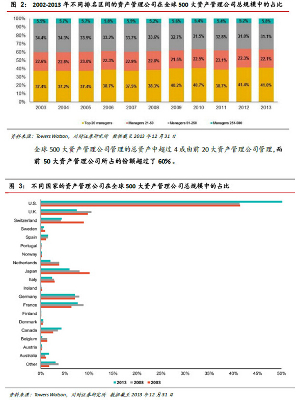 1.關(guān)于全球500 大資產(chǎn)管理公司:1)截至2013 年年底,全球500 大產(chǎn)管理公司管理的總資產(chǎn)規(guī)模達到76.5萬億美元,同比增長12.0%,首超過危機之前的2007 年的水平;2)其中北美地區(qū)的資產(chǎn)管理公司的規(guī)模是42 萬億美元,同比增長17.0%;歐洲為26.3 萬億美元,同比長9.8;日本為4.6 萬億美元,同比減少5.5%;3)超過6 成的資產(chǎn)由全球前500大資產(chǎn)管理公司管理。