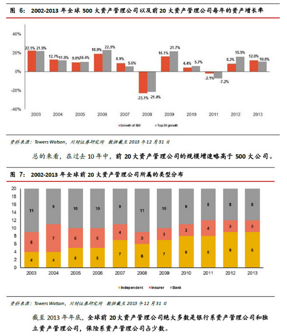 3.其它:1)截至2013 年年底,全球前20 大資產(chǎn)管理公司中有12 家自美國,8 家來自歐洲;絕大多數(shù)是銀行系和獨立資產(chǎn)管理公司,保險資產(chǎn)管理公司占少數(shù);2)中國大陸的資產(chǎn)管理公司只有華夏基金管理有限公司一家勉強進入前200 名,而巴西卻有4 家資產(chǎn)管理公司排在前100名以內(nèi),中國的資產(chǎn)管理行業(yè)潛力巨大且任重道遠。