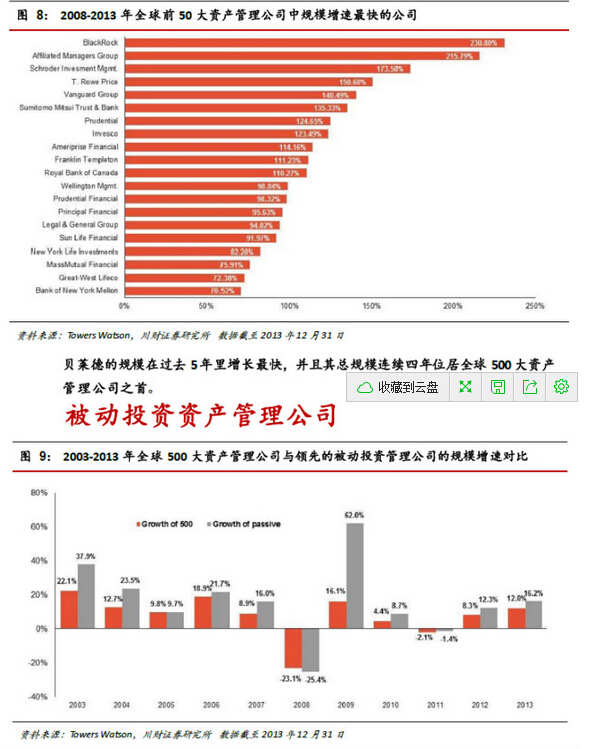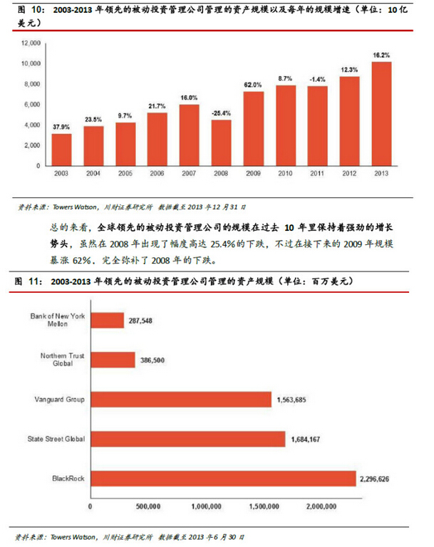2.關(guān)于領(lǐng)先的被動投資資產(chǎn)管理公司:2003 年以來,領(lǐng)先的被動投資產(chǎn)產(chǎn)管理公司的規(guī)模增長迅速,年均復合增長率達到12.4%,而全球500大資產(chǎn)管理公司只有5.8%。